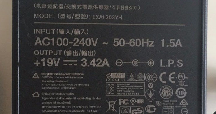 Những chỉ số này cho ta biết bộ sạc trên có công suất đầu ra khoảng 65W (công suất = điện áp x dòng điện – 19V x 3.42A ~ 65W) điện áp đầu ra của bộ sạc là 19 Volt và dòng điện cực đại có thể cung cấp là 3.42 Ampe. Tuy nhiên trong một vài trường hợp thì bạn có thể sạc với nguồn đầu ra trong khoảng 18-20V, hoặc với dòng điên A cao hơn thông số quy định cũng rất ít ảnh hưởng tới máy. VD 19V - 3.42A bạn vẫn có thể dùng loại 19v - 4.7A, ngược lại với số Ampe thấp hơn quy định như máy dùng 3.42A bạn dùng sạc 19V - 2.4A vẫn được nhưng cục sạc sẽ rất nóng gây ảnh hưởng tới máy.