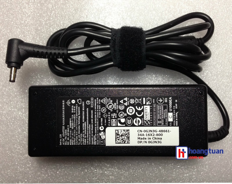 Sạc Dell 19.5v - 4.62A đầu đạn nhỏ có màu đen, trên bề mặt sạc có ghi đầy đủ các thông tin về thông số kỹ thuật và nguồn gốc xuất xứ. Một bộ Sạc Dell 19.5v - 4.62A đầu đạn nhỏ bao gồm một sạc và một dây nguồn AC.
